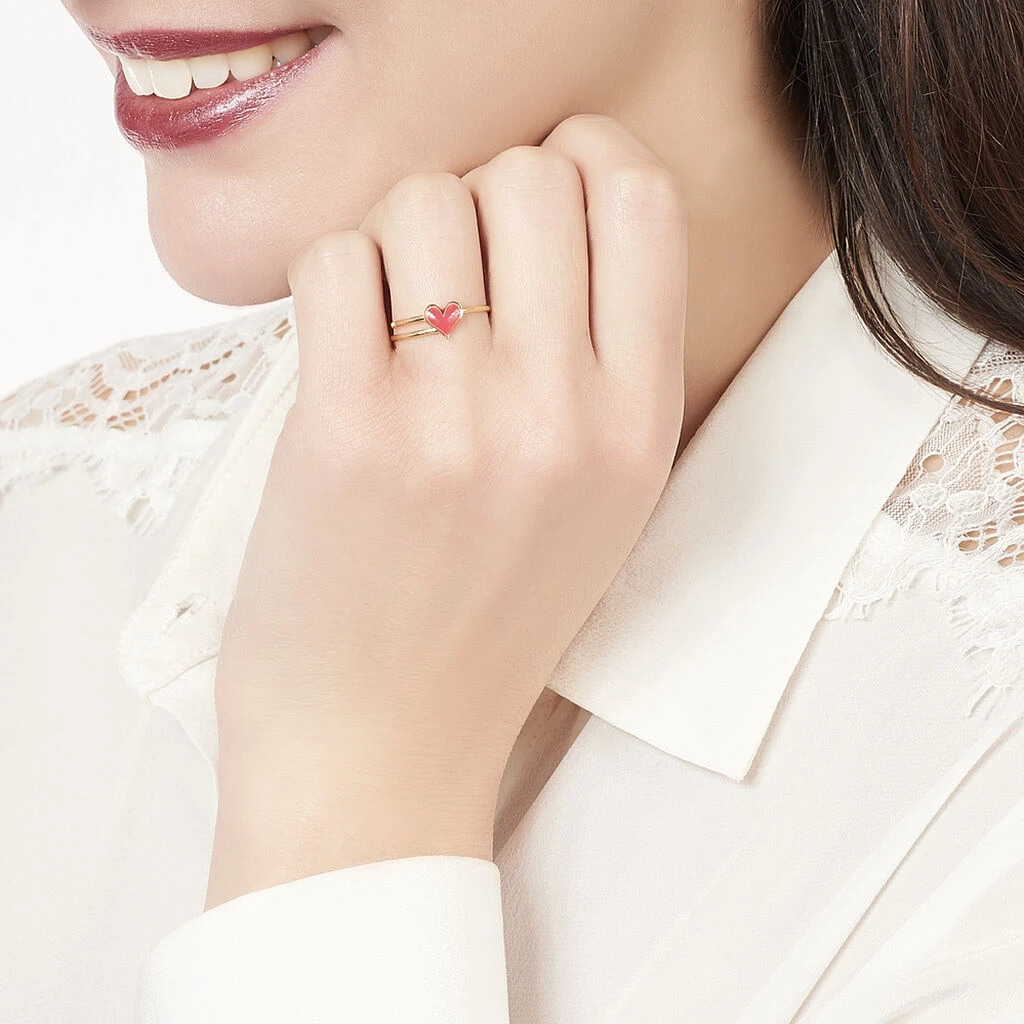Bague Or Jaune 375/1000 Cœur Smalto Rouge Ajustable