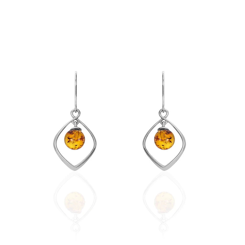 Boucles D’oreilles Pendantes Argent Blanc 925/1000 Forme Losange Ambre Cognac