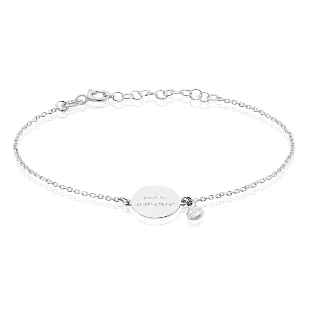 Bracelet Argent 925/1000 Pastille Gravée Mon Amour Pampille Glitter Argent Maille Forçat 45cm