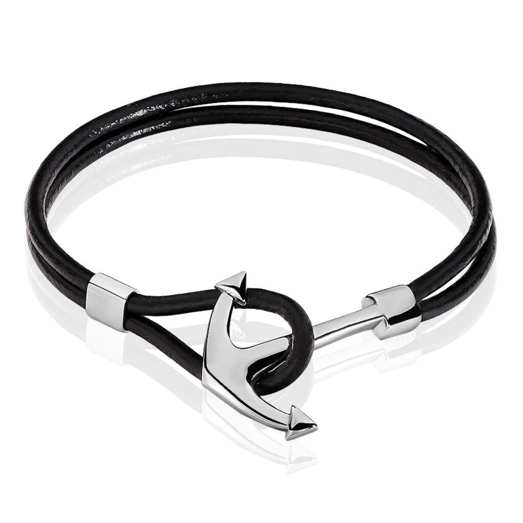 Bracelet Acier Cedric Ancre Et Cordon Cuir Noir 22cm