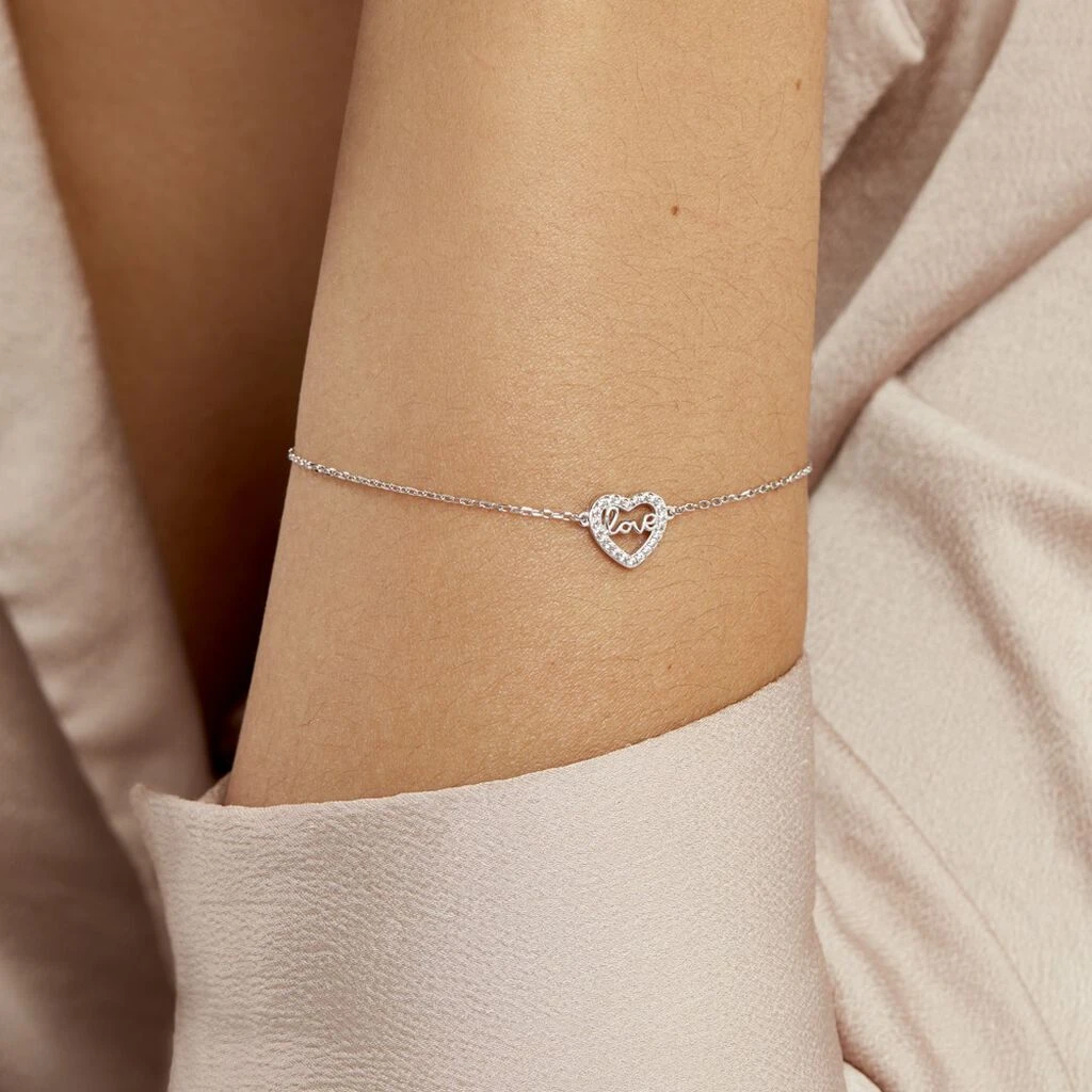 Bracelet Argent Blanc 925/1000 Motif Cœur Pave Oxydes De Zirconium + Ecriture Love 18cm