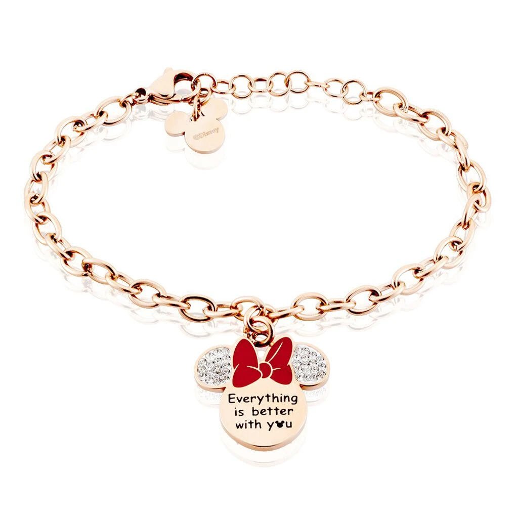 Bracelet Disney Acier Doré Rose Pampille Tête De Minnie Noeud Rouge Cristaux Blancs Maille Forçat 18.5cm 72-dst.70008l/02rg