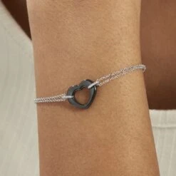 Bracelet Argent Blanc 925/1000 Coeur Ceramique Noire Et Oxydes De Zirconium Chaine Double 19cm