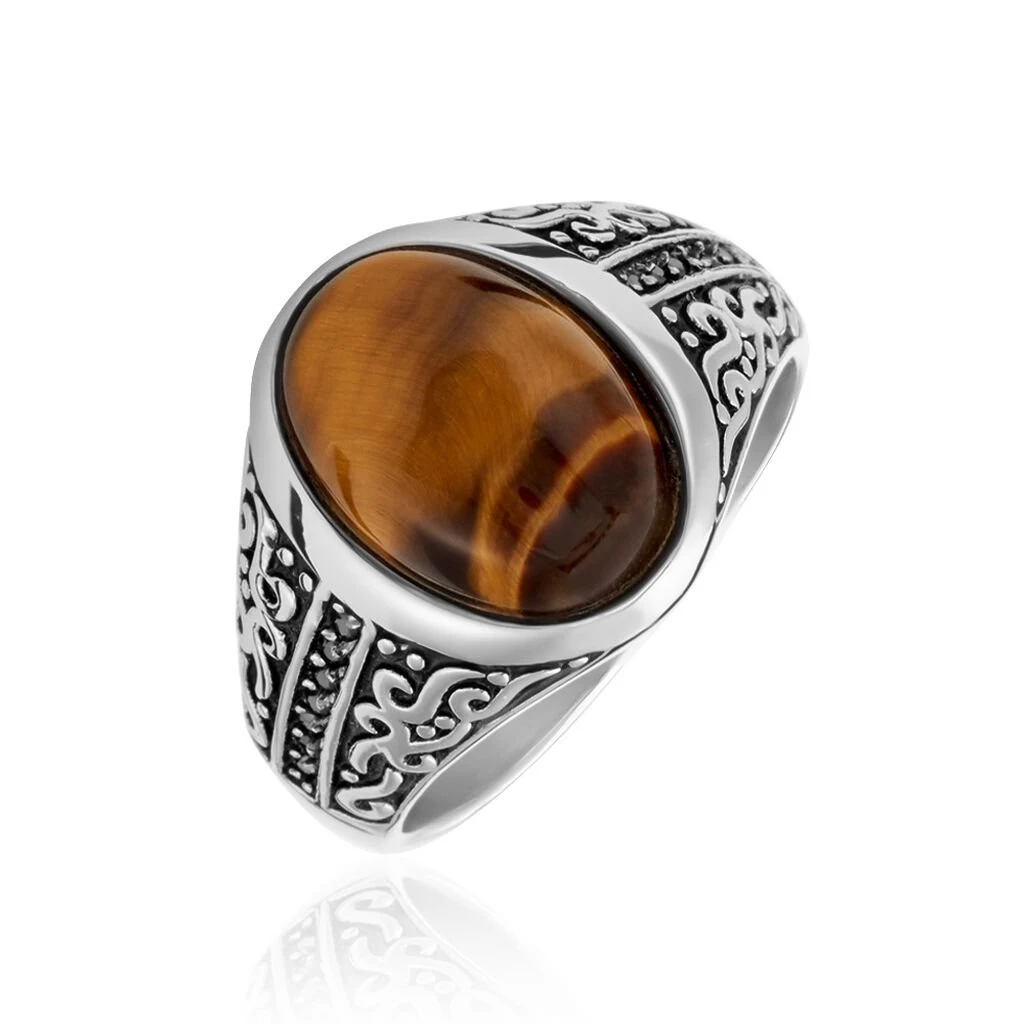 Chevaliere Acier Vieilli Plateau Ovale œil De Tigre