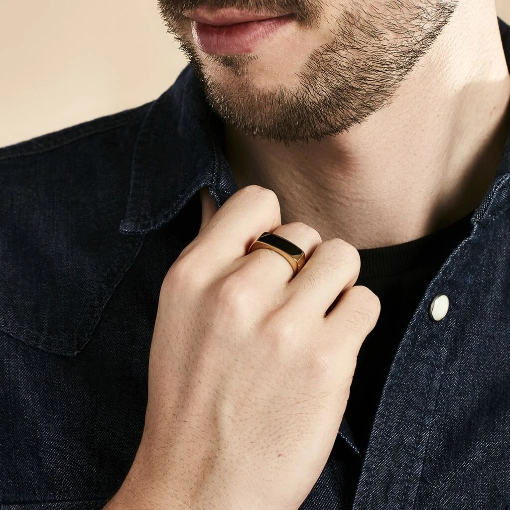 Chevaliere Plaque Or Jaune Plateau Rectangle Email Noir