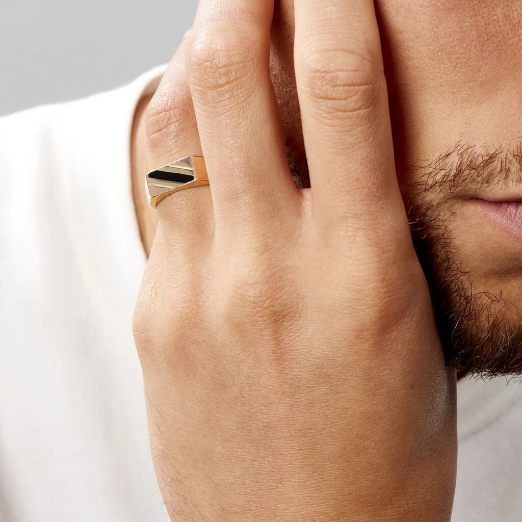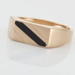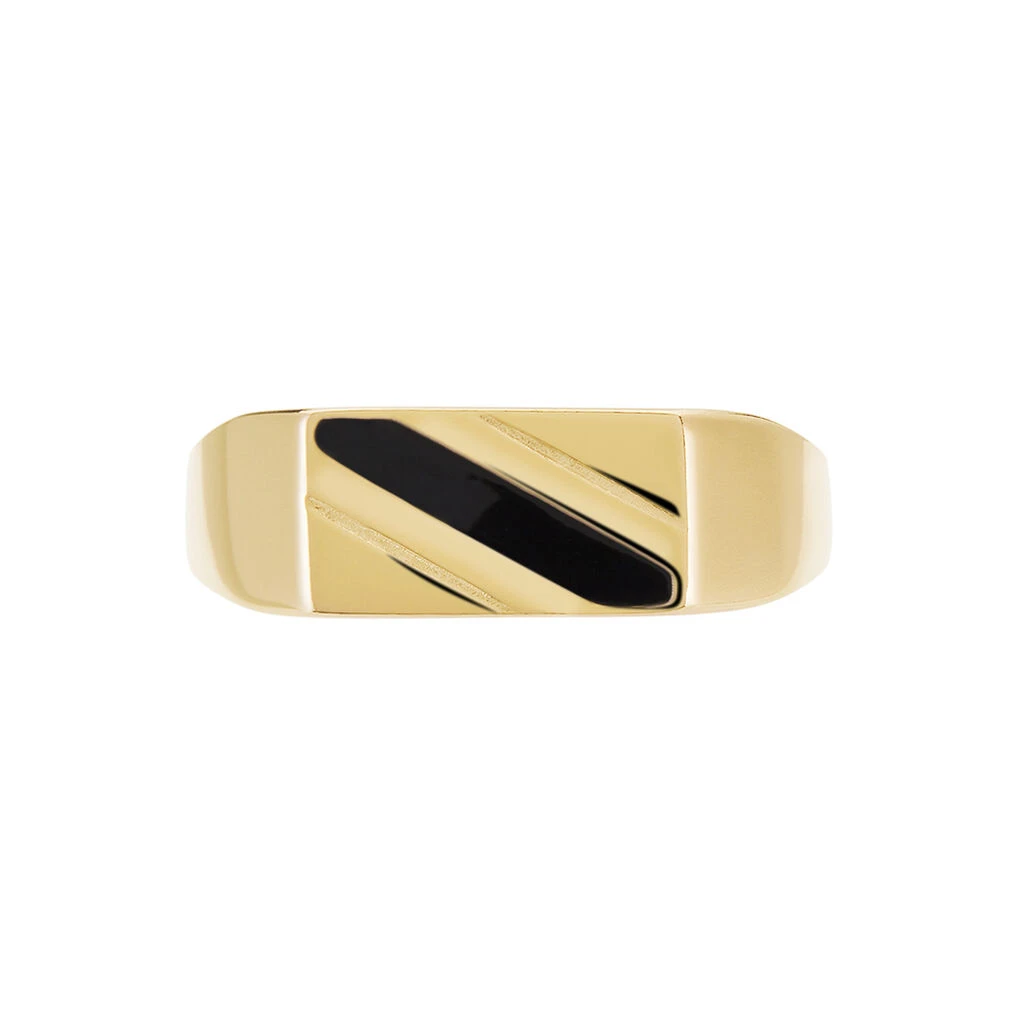 Chevalière Plaqué Or Jaune Forme Rectangulaire Striee Email Noir