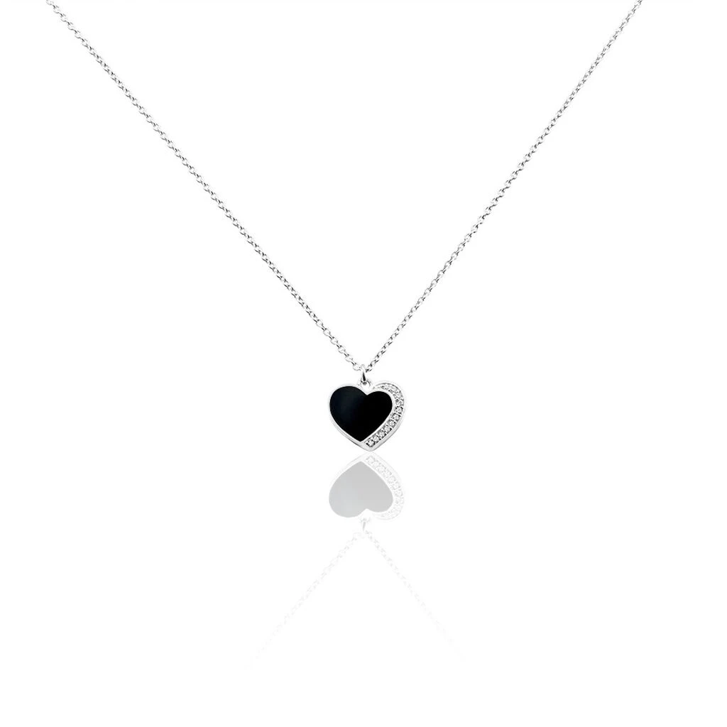 Collier Argent Blanc 925/1000 Cœur Email Noire Pavage Oxydes De Zirconium Maille Forcat 42+3cm