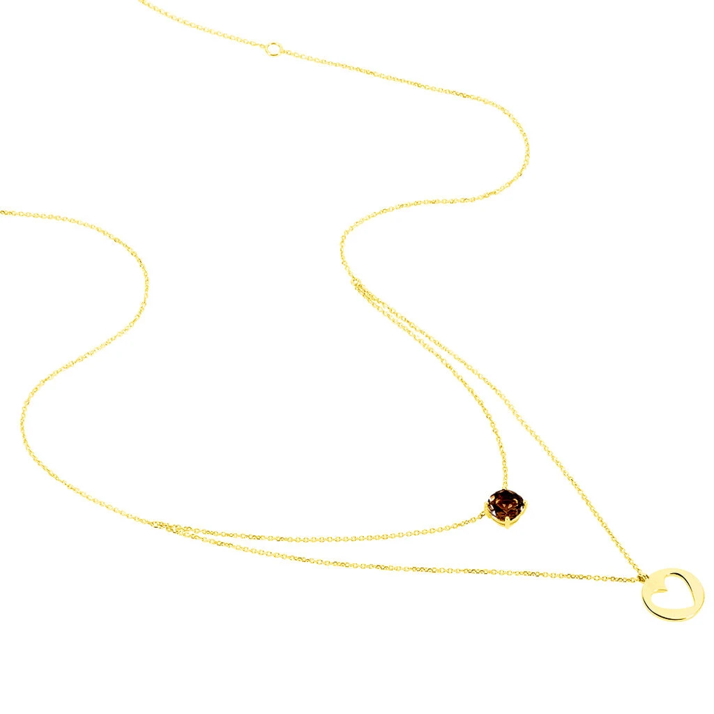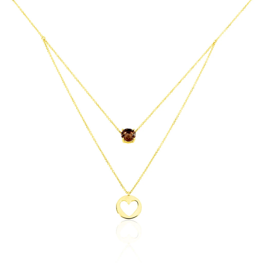 Collier Or Jaune 375/1000 Double Chaines Pendentif Quartz Fume Et Pastille Cœur Ajoure 42cm
