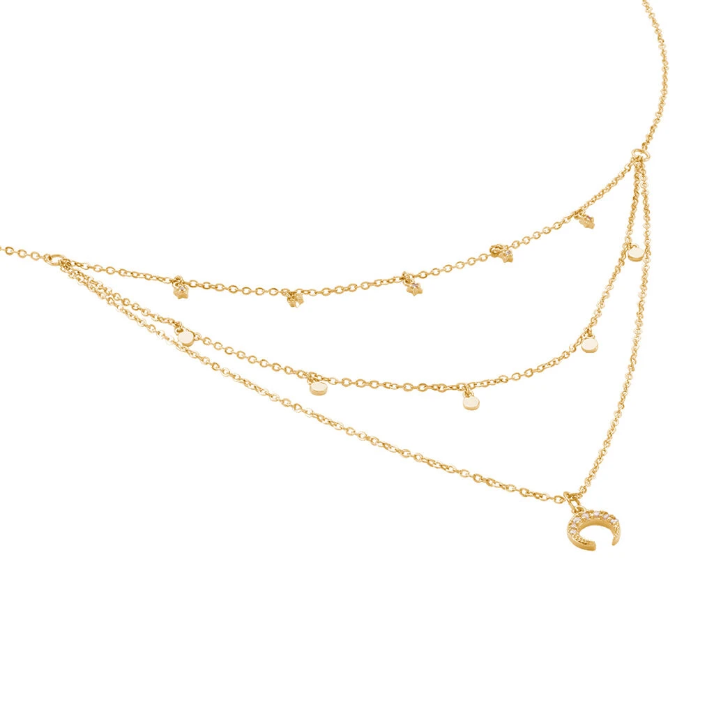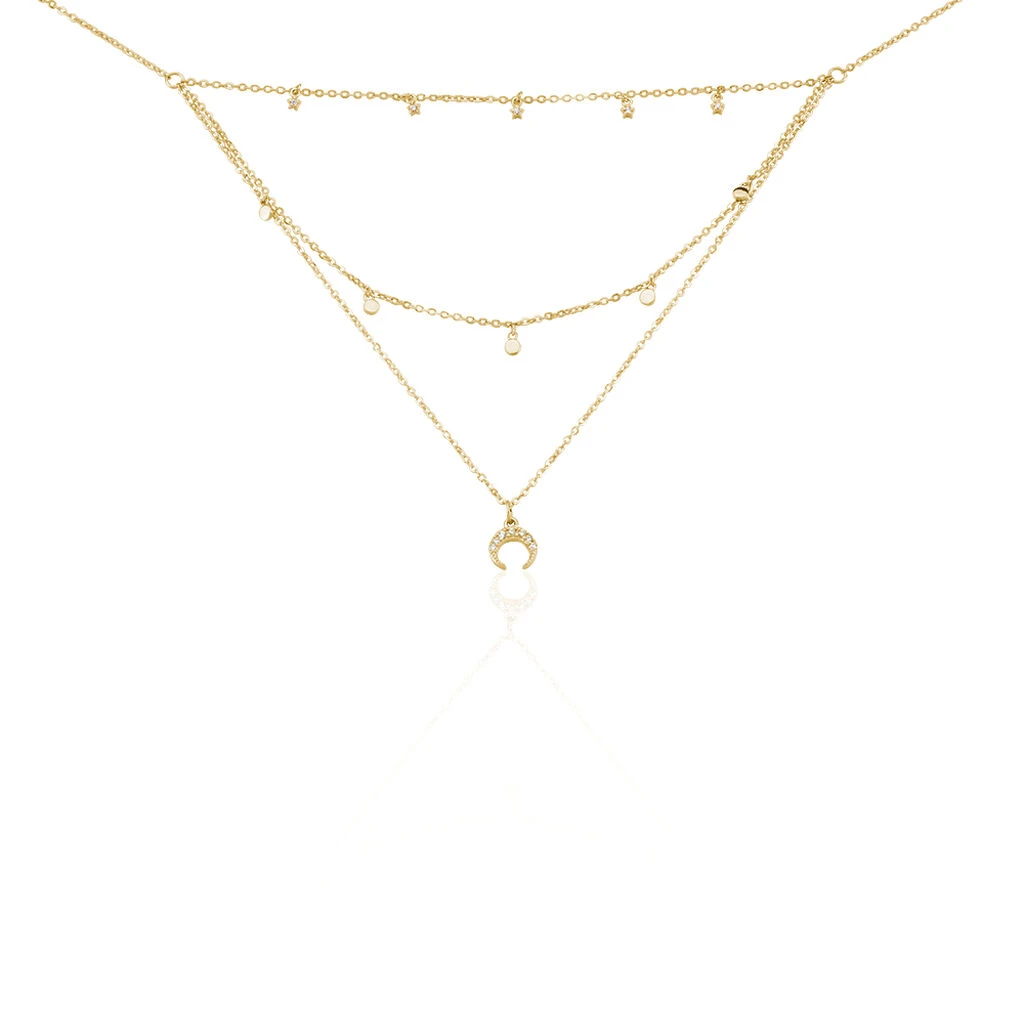 Collier Plaqué Or Jaune Lune Et Pampilles Triple Chaines Oxydes De Zirconium 48cm