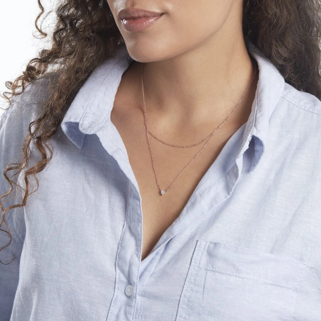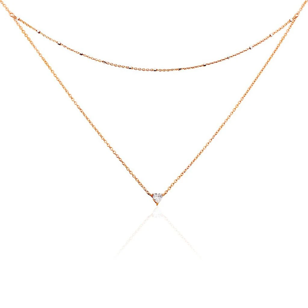 Collier Double Chaines Argent Rose 925/1000 Coeur Serti Griffes Oxydes De Zirconium Maille Forçat 45cm