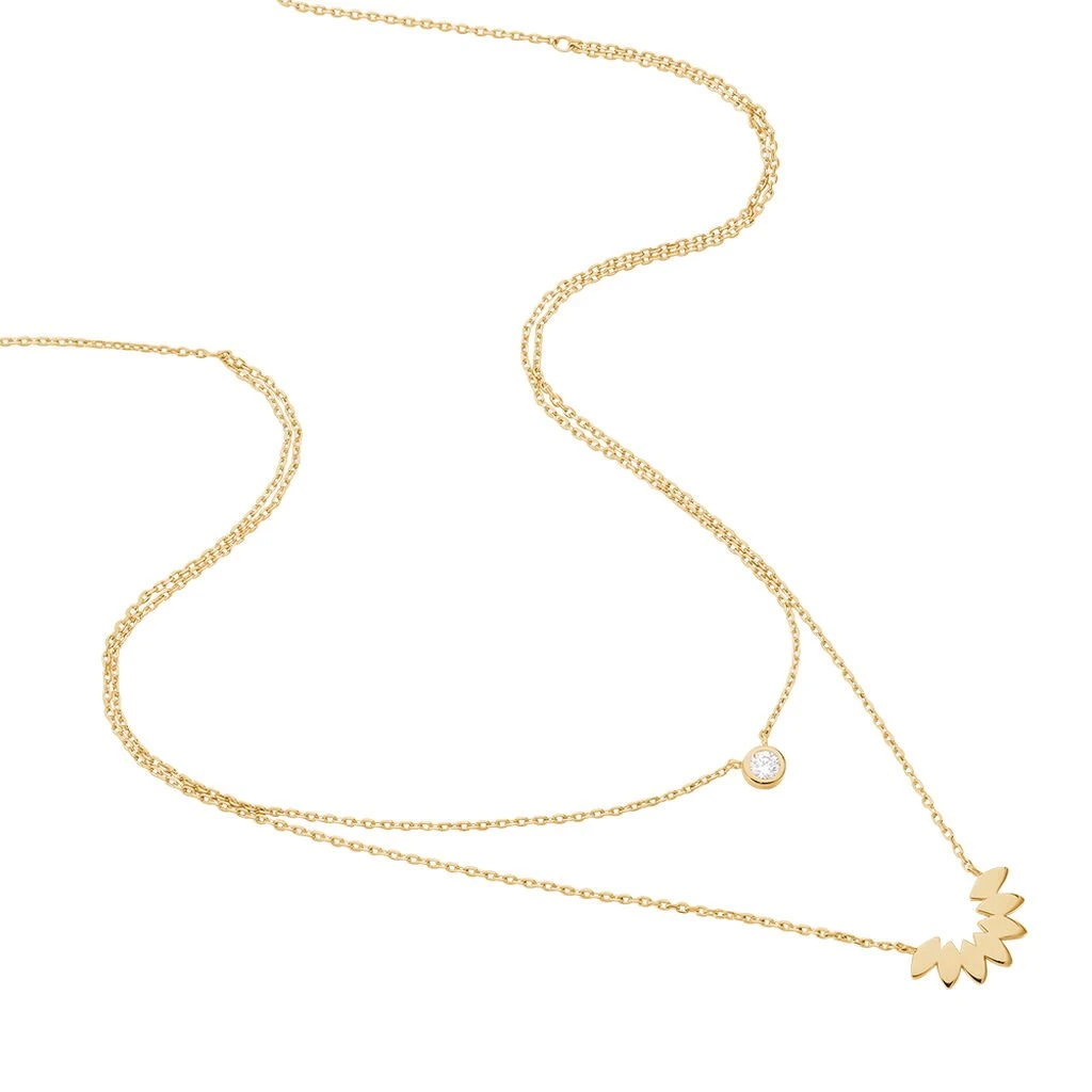 Collier Plaqué Or Jaune Double Chaines Motif Demi Fleur Et Oxyde De Zirconium 45cm