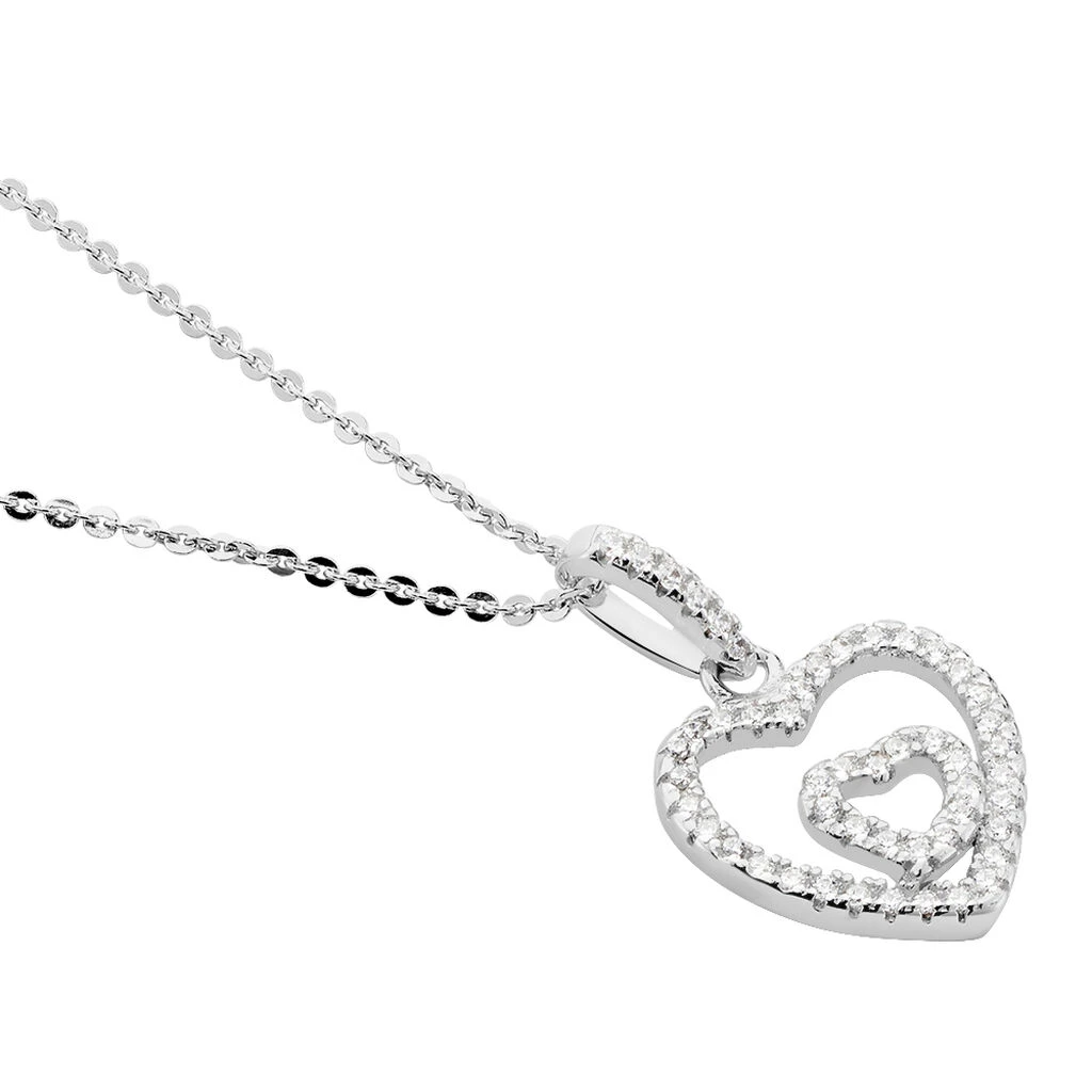 Collier Argent Blanc 925/1000 Double Coeur Ajoure Pavage Oxydes De Zirconium 42cm